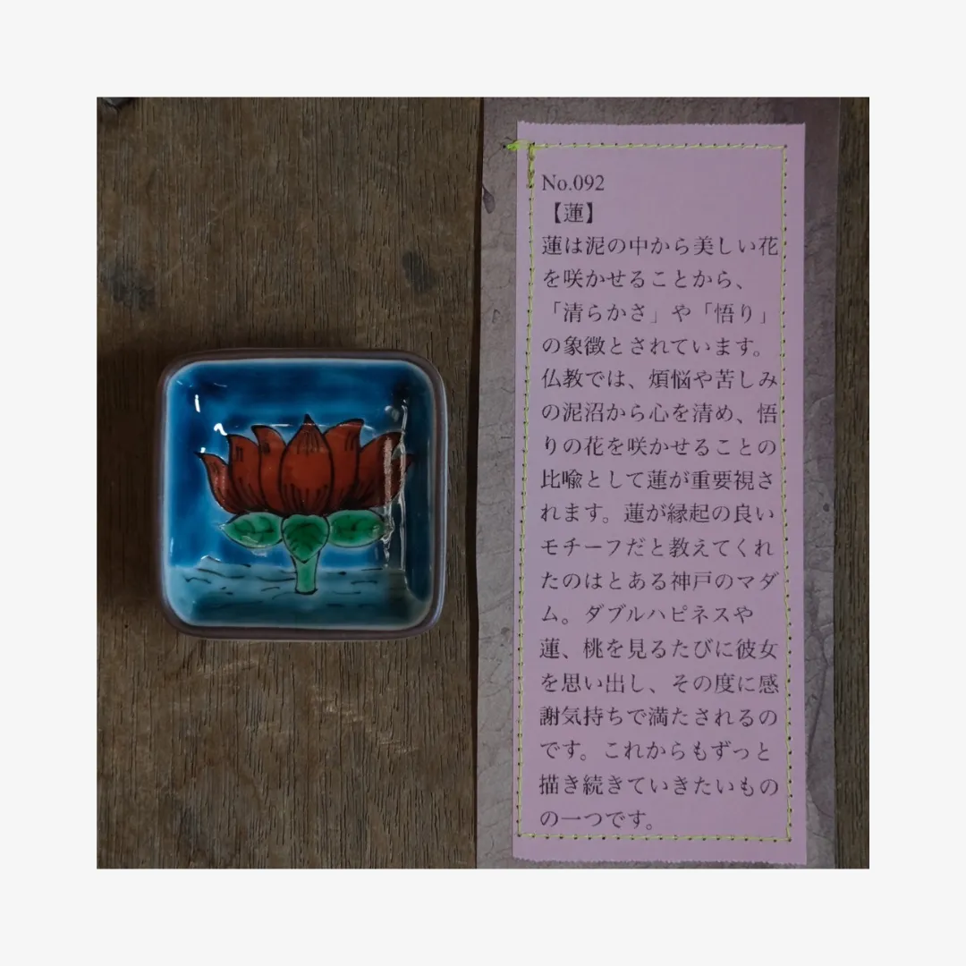 展示では、すべて絵付けの異なる100枚の豆皿がずらりと並びました。
